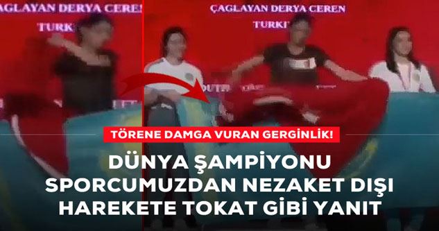 Türk bayrağını kapatmaya çalışan Kazak sporcuların davranışlarını engelleyen sporcumuz Derya Ceren Çağlayan'ın o hamlesi ödül törenine damga vurdu.