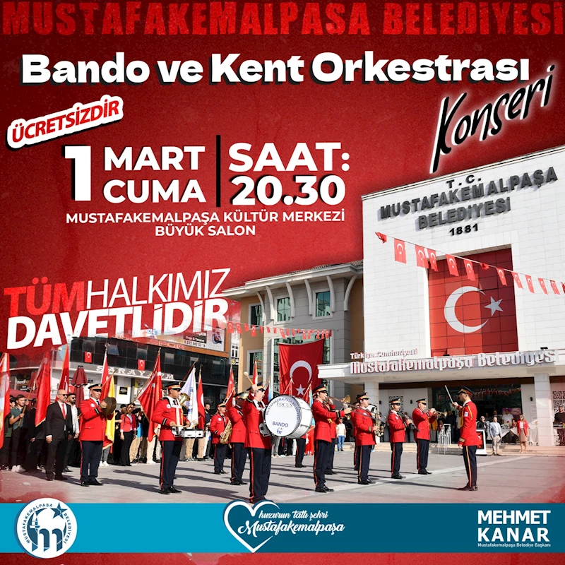Mustafakemalpaşa Belediyesi Bando ve Kent Orkestrası konseri 1 Mart Cuma Saat 20:30'da Mustafakemalpaşa Kültür Merkezi'nde ücretsizdir.