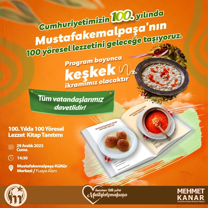 Mustafakemalpaşa Belediyesi Kültür Müdürlüğü bünyesinde hazırlanan lezzet dolu kitap, 29 Aralık Cuma günü yapılacak olan özel lansman ile ilçe halkına sunulacak. 100. Yıla özel 100 yöresel lezzeti içeren kitap, ilçenin geleneksel yemek tariflerini, hikâyelerini ve unutulmaya yüz tutmuş lezzetleri içeriyor. Yerel aşçılardan alınan tariflerle şekillenen kitap, Mustafakemalpaşa'nın mutfak kültürünü yaşatmayı ve gelecek nesillere aktarmayı hedefliyor.
