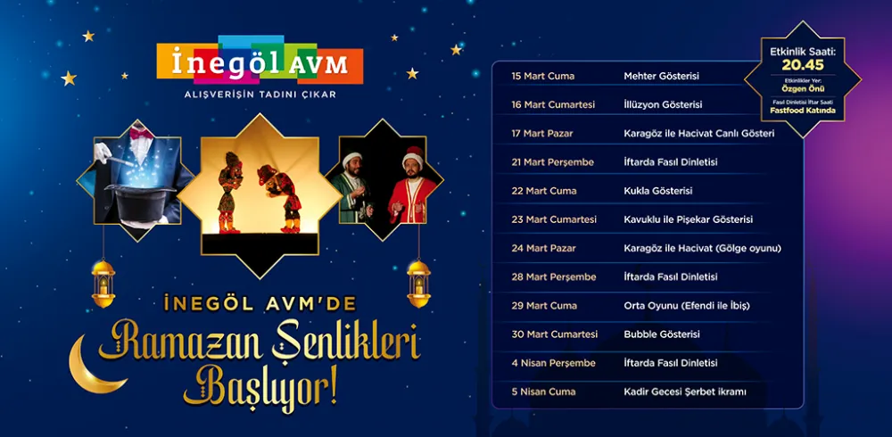 Fiba CP’nin yatırımcısı ve yöneticisi olduğu, çocukları ve aileleri her ay yeni etkinlik ve kampanyalarla buluşturan İnegöl AVM; Ramazan ayına da coşkuyla giriş yapıyor. Hacivat Karagöz gösterileri, fasıl dinletileri, mehter gösterisi ve daha birçok etkinlikle, Ramazan ayının coşkusu ve maneviyatı bu sene de İnegöl AVM’de yaşanacak.