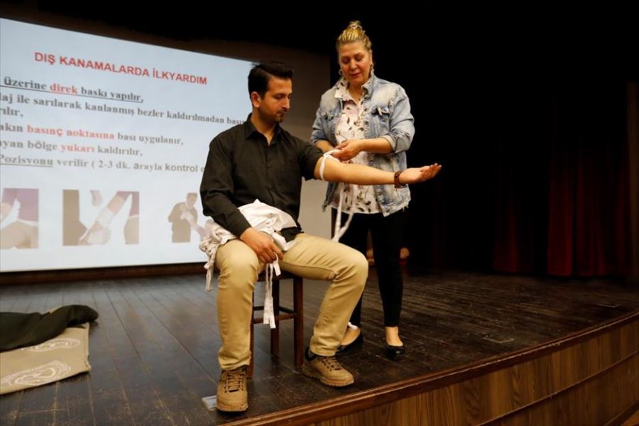 Eğitimde boğaza cisim kaçması konusunda; boğulma belirtileri, bebeklere, çocuklara ve yetişkinlere nasıl müdahale edilebileceği, tam tıkanmada (Solunumum tamamen durması-Heimlich manevrası) yapılacaklar, hava yolunu açma teknikleri anlatılırken basit yaralanma konularında ise; yaralanma çeşitleri, kanamaları durdurma yöntemleri, turnike tekniği uygulaması, vücutta baskı yapılarak kanama durdurma alanları gösterildi. Ayrıca kalp krizi, koma, şok durumlarında olay yerinde ilk yardım müdahalelerinin nasıl ve ne şekilde yapılacağı hakkında katılımcılara bilgiler verildi. 414 kişinin katıldığı eğitim Kale OSGB uzmanlarından Saime ÖZYILMAZ tarafından gerçekleştirildi.