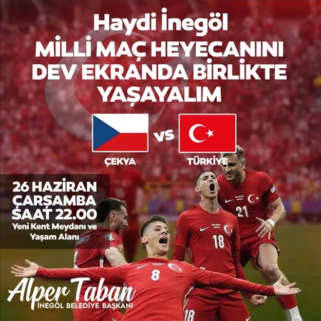 İnegöl Belediyesi, EURO 2024 Avrupa Futbol Şampiyonası kapsamında Milli Takımımızın oynayacağı Çekya maçı için Yeni Kent Meydanında dev ekran kurulacağını duyurdu. Belediye Başkanı Alper Taban, tüm ilçe halkını bayrağını alıp mill