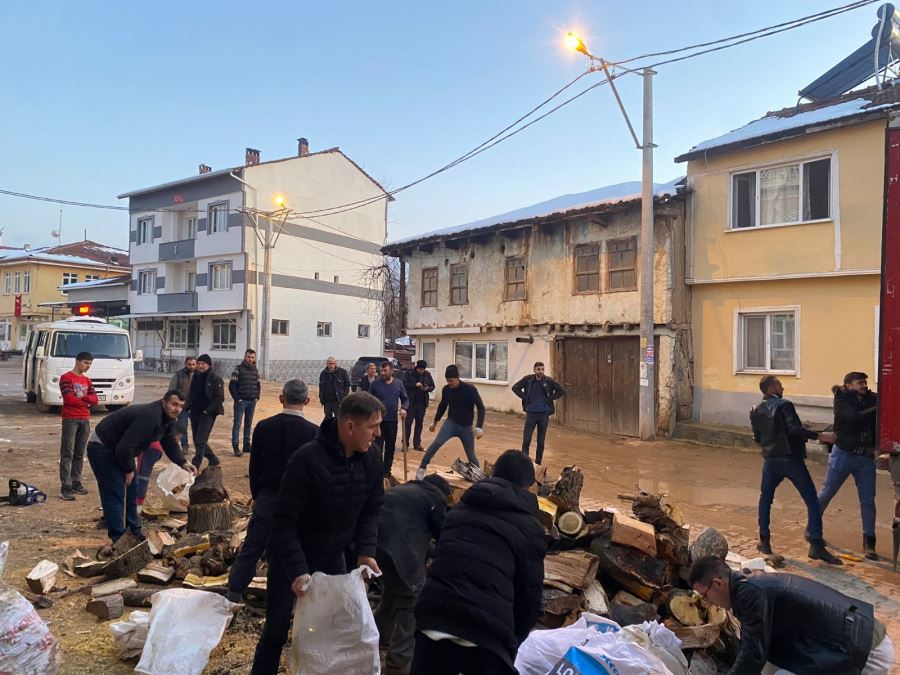 Bu kapsamda mahalle sakinleri meydanda odunları ufalayarak çuvallara yerleştirdi. Daha sonra ise çuvallar tıra yerleştirilerek deprem bölgesine uğurlandı.