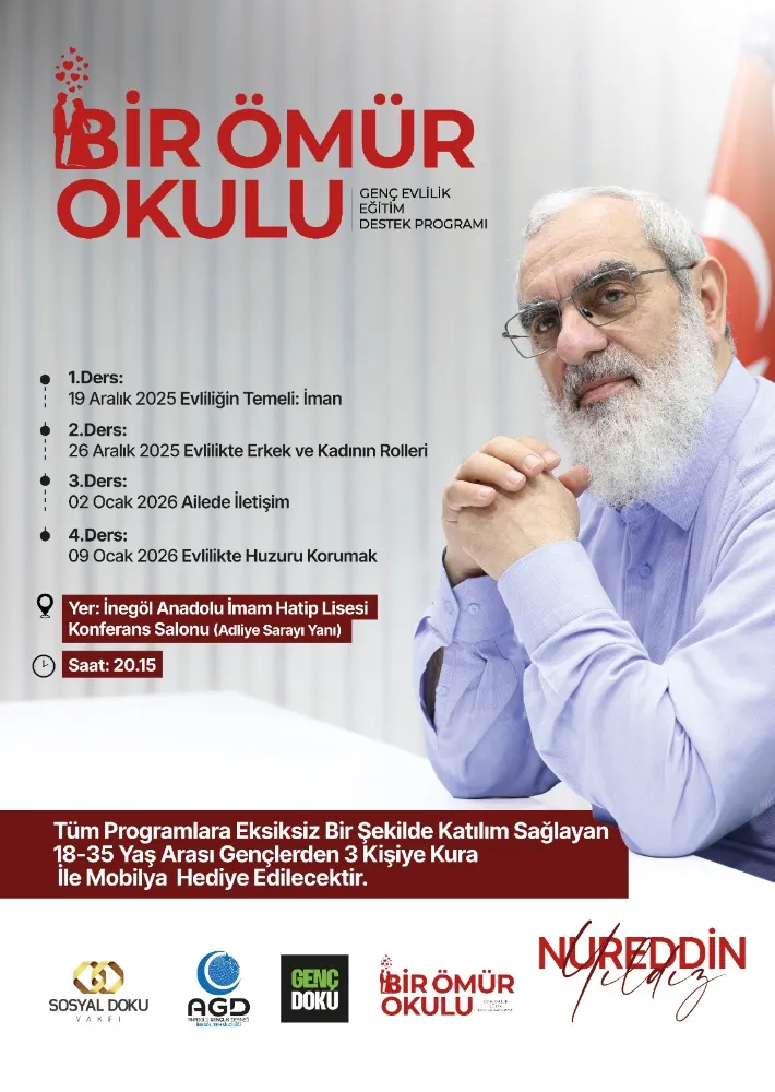 Anadolu Gençlik Derneği (AGD) İnegöl Temsilciliği, aile kurumunun güçlendirilmesi amacıyla yeni bir eğitim programını kamuoyuna duyurdu. “Bir Ömür Okulu” başlığıyla hayata geçirilecek program, 19 Aralık itibarıyla İnegöl’de başlayacak.