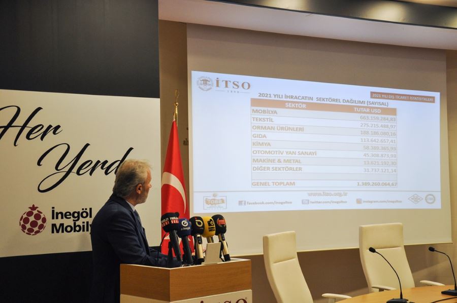 İnegöl Ticaret ve Sanayi Odası (İTSO) Başkanı Yavuz Uğurdağ, İnegöl Ticaret ve Sanayi Odası Konferans Salonu’nda Yönetim Kurulu ve Meclis Üyelerinin de katılımı ile düzenlenen basın toplantısında İnegöl’ün 2021 yılı Dış Ticaret İstatistiklerini kamuoyu ile paylaştı.