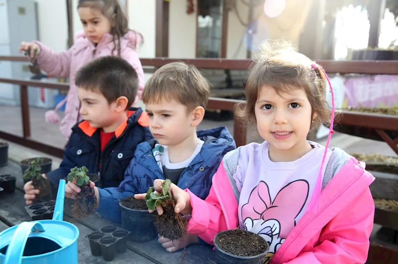 Nilüfer Belediyesi’nin ekolojik tarım koşullarında üretim yaptığı Kent Bostanları’ni gezen Nadide Topkapı Anaokulu öğrencileri, tohum ekip, çilek fidesi dikerek tarımla tanıştı.