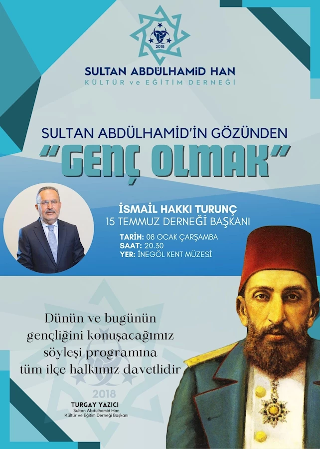 Programa ilişkin açıklama yaparak tüm ilçe halkına davette bulunan Sultan Abdülhamid Han Kültür ve Eğitim Derneği Başkanı Turgay Yazıcı, “Amacımız cumhuriyetin gençlerine tarihimizi ve tarihimizde iz bırakmış büyüklerimizi en iyi şekilde anlatmak ve tanıtmak. Bu kapsamda gücünü tarihinden alan bir millet olarak, son döneme damgasını vurmuş liderlerden Cennet Mekan Sultan Abdülhamid Han’ı da yeni nesle en doğru şekilde tanıtıp anlatmayı amaç edinmekteyiz. Günümüzün gereklilikleriyle beraber geçmişin tecrübesinin pekiştirilerek geleceğin güçlü Türkiye’sinin temellerini atmayı hedefleyen, kendi geçmişi ve köklerine sahip çıkan, örf, adet ve ananelerine sahip çıkan nesiller yetiştirmeyi hedeflemekteyiz. Bu minvalde Sultan Abdülhamid Han Kültür ve Eğitim Derneği olarak Sultan Abdülhamid Han Gözünden Genç Olmak söyleşilerinin ilki; geçmişte Kızılay Genel Başkanvekilliği yapmış ve halihazırda 15 Temmuz Derneği Başkanlığı görevini sürdüren, vizyoner kimliği ve enerjisiyle gençlerin ağabeyi konumundaki Sayın İsmail Hakkı Turunç’un katılımıyla yapılacaktır. Sayın İsmail Hakkı Turunç’un gençlerle buluşmasına vesile olmak, burada günümüzün konuları konuşulurken tarih anlatımlarıyla Sultan Abdülhamid’in gençlere çizdiği yolu işaret etmek amacıyla yapılan programa tüm ilçe halkımız davetlidir” dedi.